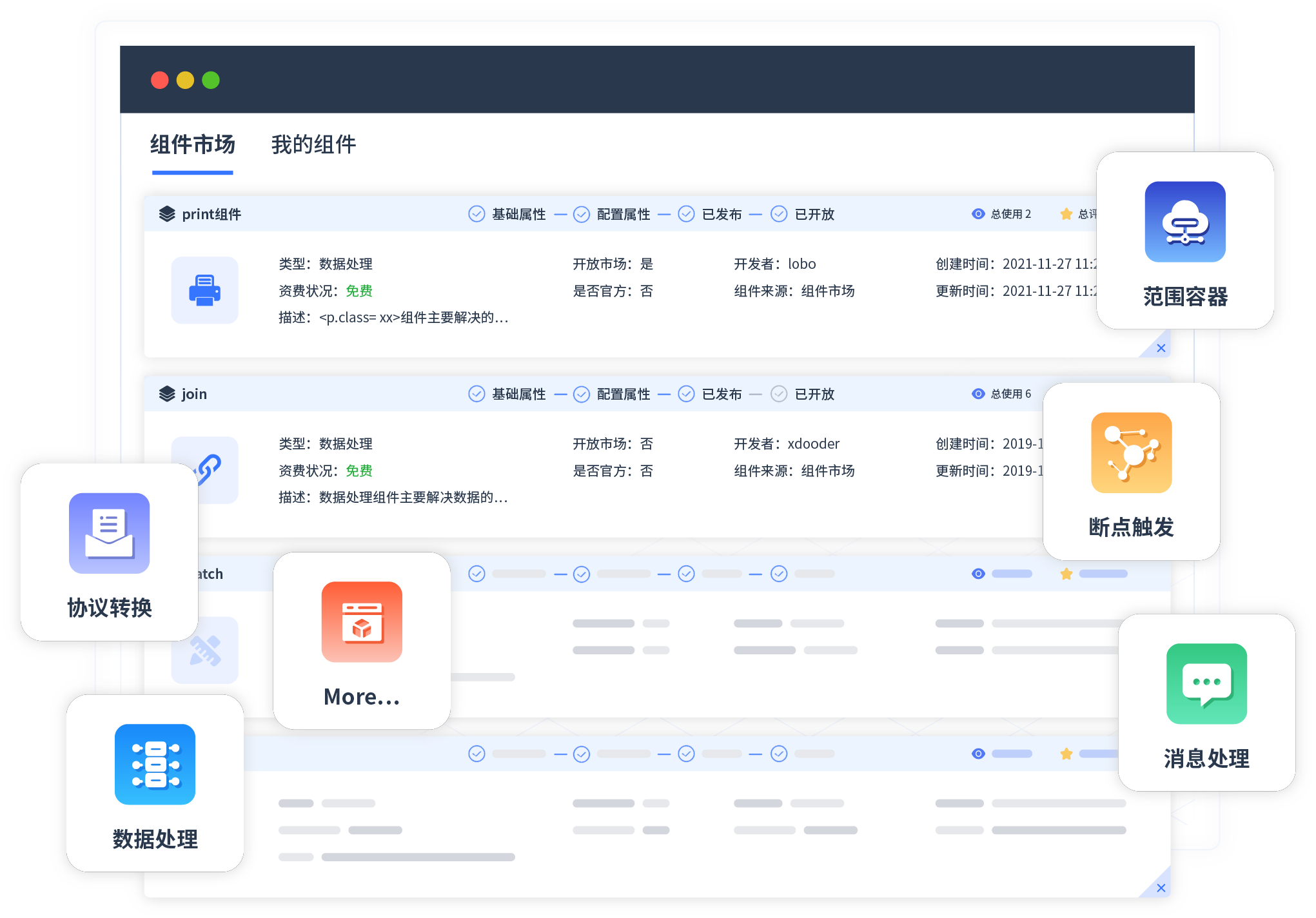 针对集成场景,凯发k8一触即发提供组件市场,例如协议转换、消息处理、文件操作等。除平台提供的组件外,客户可以自定义所需组件。