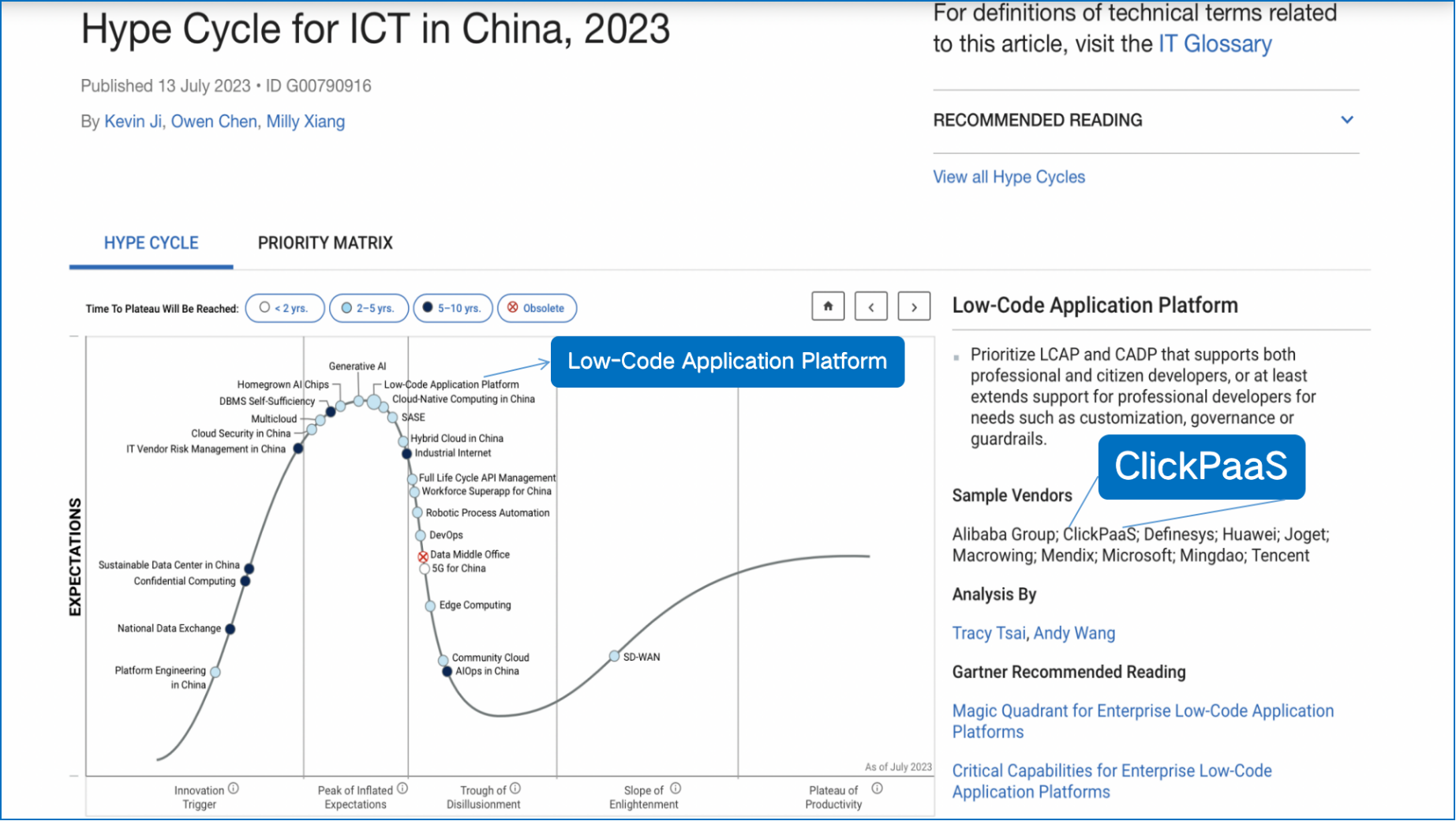 近日,国际权威研究机构Gartner发布了《Hype Cyple for ICT in China,2023(2023年中国ICT技术成熟度曲线)》报告,凯发k8一触即发凭借平台的aPaaS+iPaaS+DaaS保障业务系统的一站式设计,多租户、热发布、国际化、信创安全等特性实力登榜,并作为低代码PaaS平台代表厂商TOP2入选本次报告。